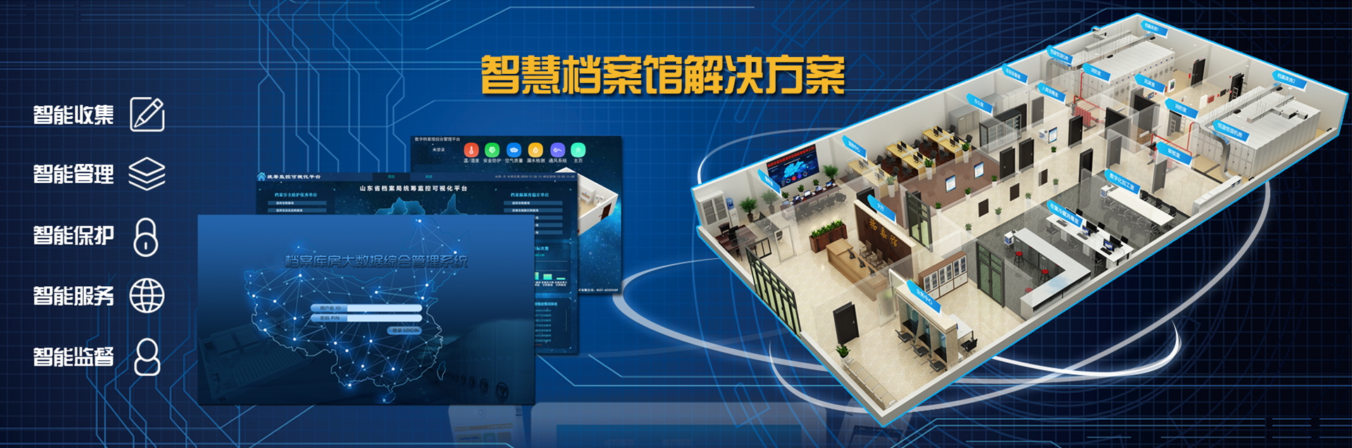 國韻根據(jù)山東省委宣傳部檔案管理的實際需求,為其設(shè)計建設(shè)了檔案庫房智能化綜合管理系統(tǒng),該系統(tǒng)將溫濕度自動測控、智能防火、智能防盜、消毒滅菌等檔案保護功能集成于綜合管理平臺,實現(xiàn)了檔案保護管理的智能化。該項目改善了山東省委宣傳部檔案庫房的環(huán)境,強化了對檔案的管理和保護。